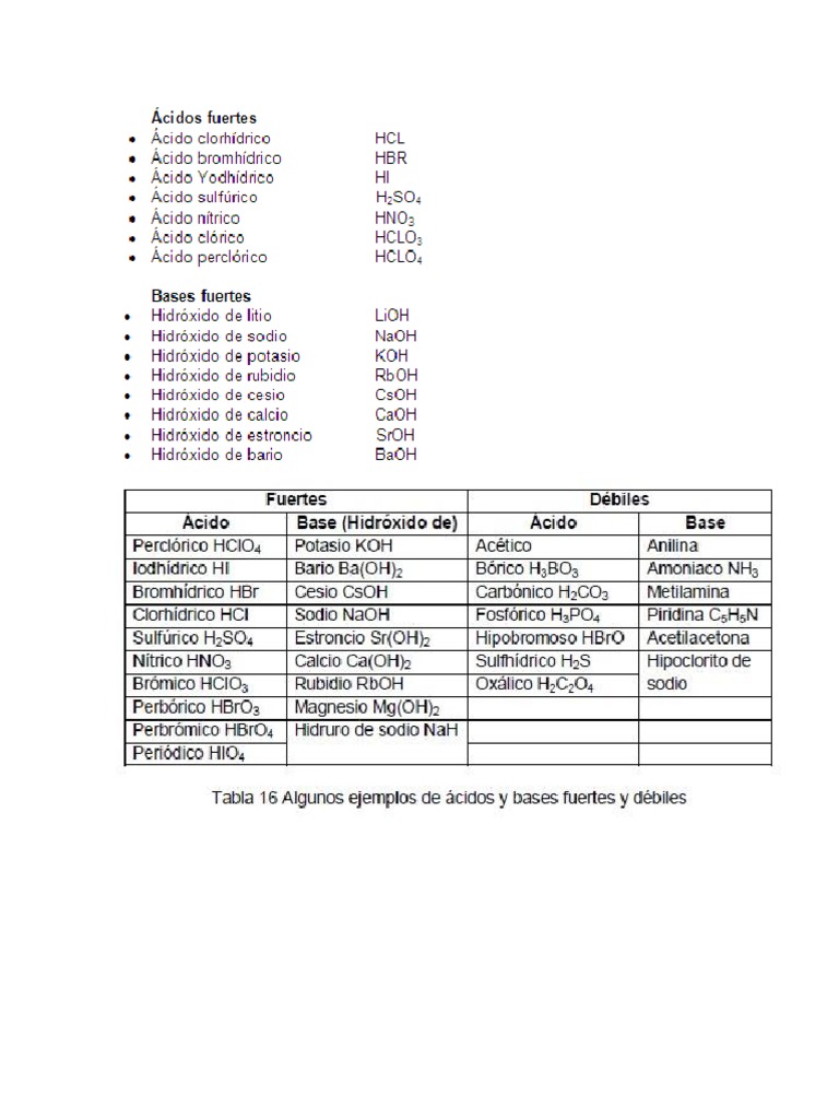 Siendo bases fuertes por ejemplo el hidróxido de sodio y de potasio. Ácido base. Lista de acidos y bases fuertes y debiles mas comunes ACIDOS FUERTESPerclórico HClO4Sulfúrico H2SO4Yodhídrico HINítrico HNO3Clorhídrico HClACIDOS DEBILESAcido Nitroso HNO2Acido acético CH3-COOHAcido fosforico H3PO4Acido bórico H3BO3Acido carbónico H2CO3BASES FUERTESHidróxido de Litio LiOHHidróxido de Sodio NaOHHidróxido.